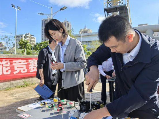 電路接線賽場同樣扣人心弦,參賽選手們屏氣凝神、全神貫注,紅綠黃黑四色電線在指尖靈活穿梭,剝線、接線、布線每一步操作都展現(xiàn)出扎實的專業(yè)功底。其中,江北水廠鐘考敏、李玥佳組成的男女搭檔更是成為全場焦點,二人沉著應(yīng)戰(zhàn)、緊密協(xié)作,最終以14分13秒、96.2分的優(yōu)異成績摘得該項目一等獎。